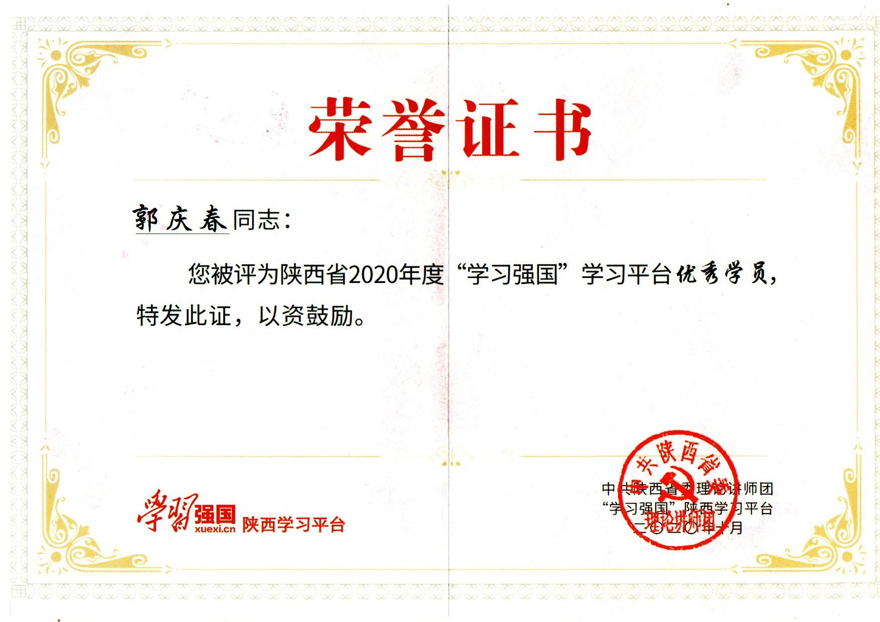 郭慶春同志榮獲“學習強國”省級優秀學員稱號