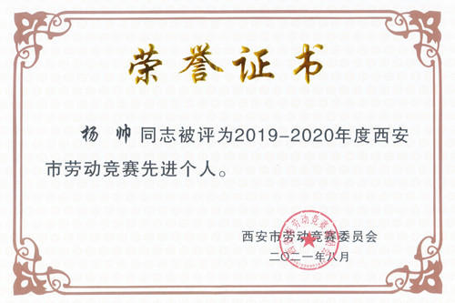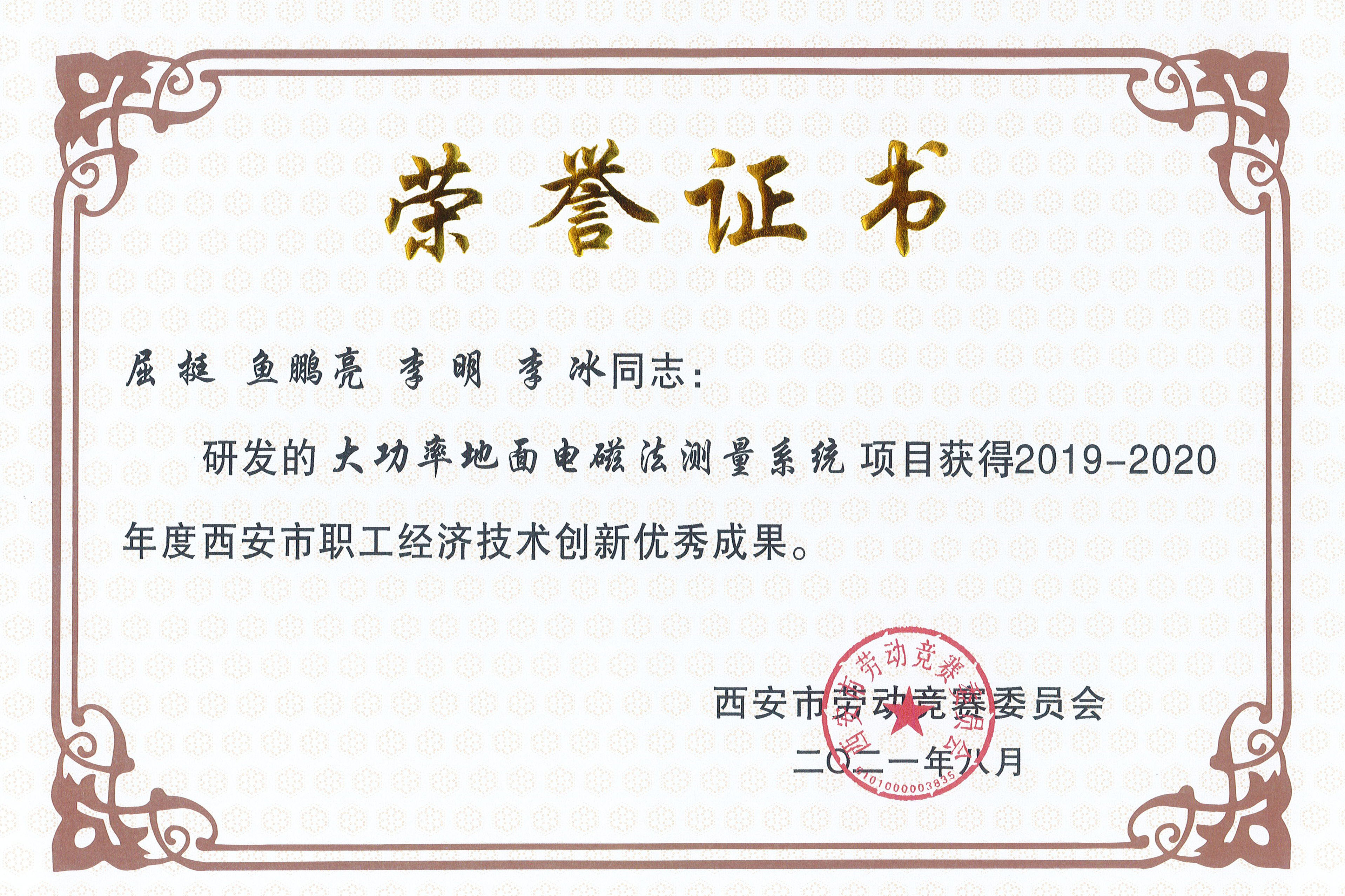 ??? 近日,從西安市勞動競賽委員會傳來喜訊,物化探隊有限公司由主任工程師屈挺牽頭,魚鵬亮、李明、李冰等共同聯合研發的“大功率地面電磁法測量系統”項目,榮獲“2020年西安市職工經濟技術創新優秀成果”稱號,工程師楊帥榮獲“2020年西安市勞動競賽先進個人”稱號。