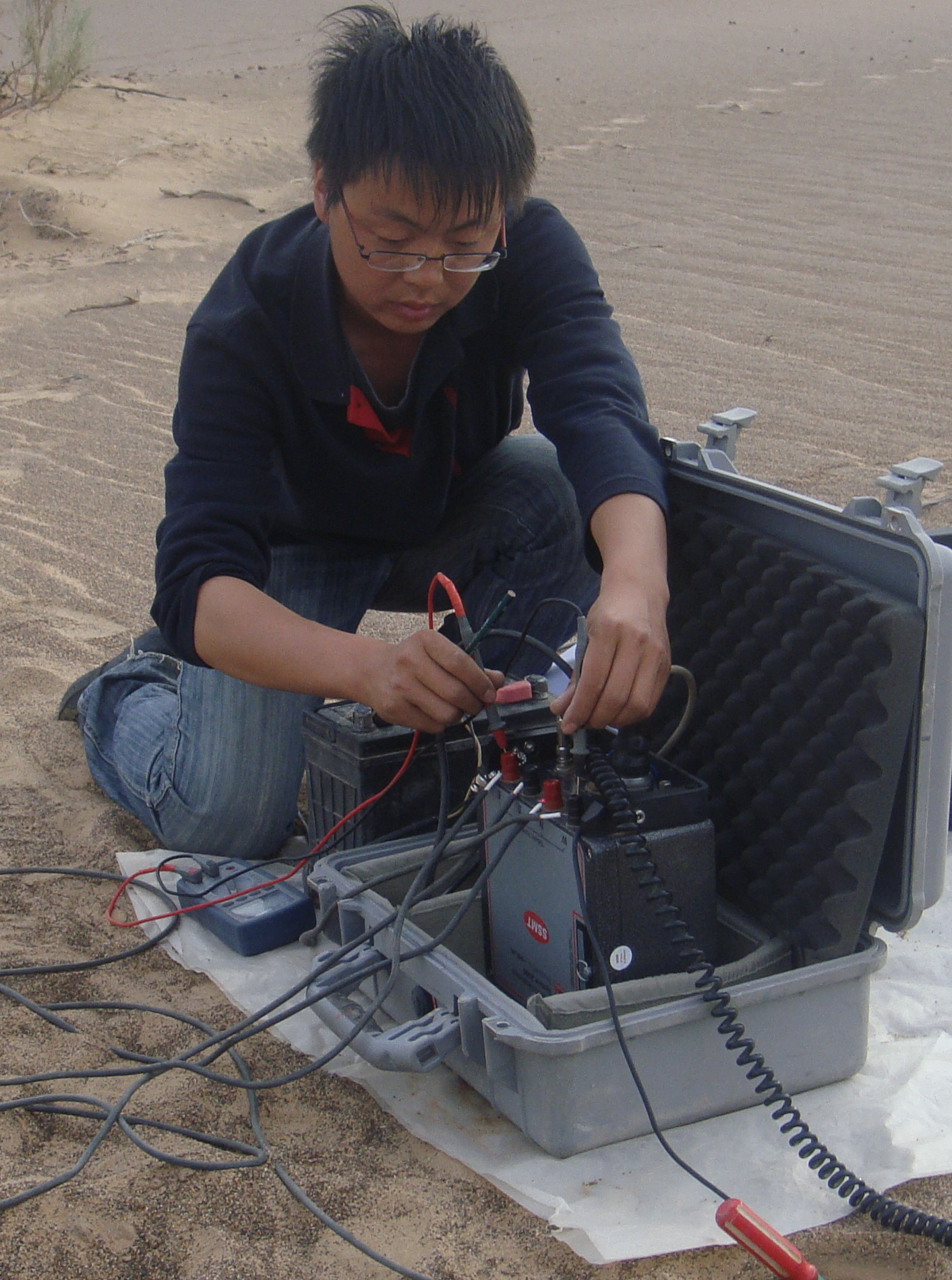 ? ? 這個項目工作區位于內蒙古自治區阿拉善盟被巴丹吉林沙漠、戈壁覆蓋,巴丹吉林沙漠沙山高陡,相對高差大,海拔最高接近4000m,氣候較干旱,有時幾乎一個月都不下雨。冬季嚴寒、干燥多風;夏季酷熱,6~8月份天氣炎熱,白天地表溫度可達50多度;11月至來年4月份,天氣寒冷、風沙大,幾乎每天風力至少在4~5級,當地有“一年一場風,從春刮到冬”的諺語。工區內人煙稀少,經過處大多為無人區,盡管項目施工有重重困難,盡管氣候條件異常惡劣,但這些都沒有難倒屈挺同志和項目組的其他成員,他在沙漠中常常徒步行進60多公里才到達目的地開始測量工作,他背電瓶,扛儀器,學測量布線、森林羅盤的使用、v8儀器的操作。這期間有一次晚上十點多,他所在組充電用的發電機突然出現故障,電瓶無法充電,直接影響第二天的正常工作,如果當晚不能正常充電,第二天則無法按照原定計劃向前推進,這樣食品、飲水等都會出現問題,在這種情況下, 屈挺同志自愿要求為二位工人用GPS引路,在夜光下翻過無數座沙山,于當晚十二點左右從距離駐地二十多公里的補給站將發電機取回,從而保證了第二天工作的正常開展,解了燃眉之急。正是由于他們項目組的出色表現得到甲方單位西安地質調查中心的認可,所以才獲得該項目后續幾年的工作。