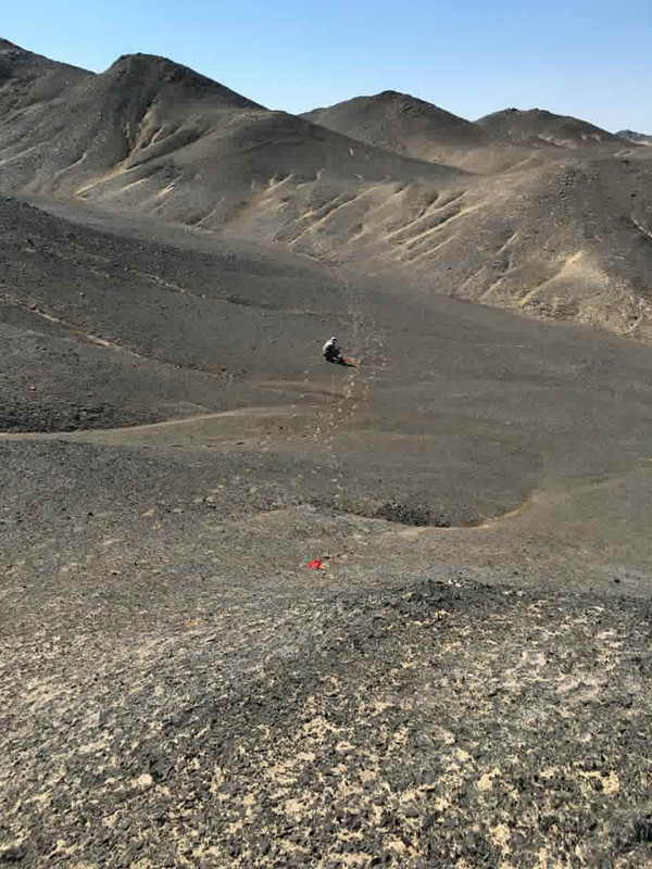 ??? 該項目工作區位于吐魯番-哈密盆地南緣低山丘陵戈壁荒漠區,干旱貧水區,幾乎無植被覆蓋,七月最熱,最高可達45℃以上,地表溫度六七十度左右,工區無水無電,生產生活用水都是從工區外100多公里拉進去,用電全靠發電機。面對惡劣環境,項目組積極采取措施保障后勤供給,在合理安排野外高溫作息時間,配備防曬防暑用品,在項目黨小組的帶領下,項目組成員團結一心,攻堅克難,早晨摸黑起床,到達工區天微微亮便開始工作,以避開中午高溫時段露天作業。目前項目實施進展順利,預計8月底完成該項目的野外勘查工作。