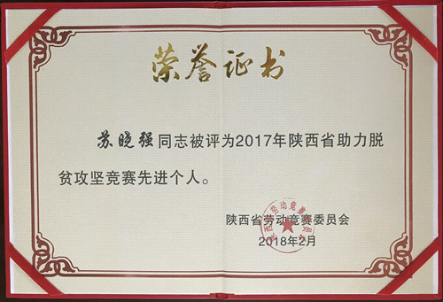 ? ? 在2018年初陜西省勞動競賽委員會開展的助力脫貧攻堅競賽中,蘇曉強同志被授予“陜西省助力脫貧攻堅競賽先進個人”榮譽稱號。